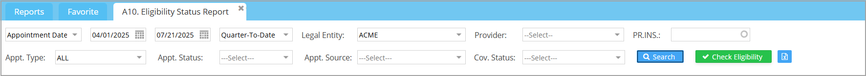 - The A10 report can be used for two main purposes. A. Run batch eligibility check in one single go– Select Appt. Date from the date filter and provide the date range. Click on