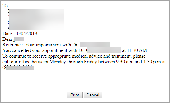 1. This report can be used to send letters to patients who have missed or canceled their appointments. To send a letter to a patient, click on the Print button (highlighted in the report output image) against the patient in the search result. This will bring up the letter. A sample letter is shown beneath.