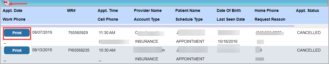 This is a report capturing the missed or canceled appointments and the option to print a no-show letter for the patients. The report contains basic patient and appointment data and the patient’s last seen date.