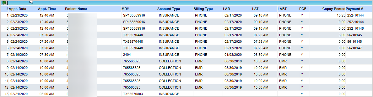 The report verifies if the required patient demographic fields are complete and eligible for billing. The report includes the patient’s last seen date and time, the copay posted amount, and the posted payment #.