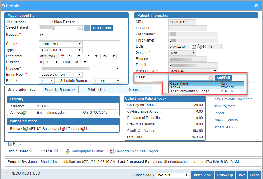 3. Click on the Case box to view the list of present cases for the patient. Select a case from the list as appropriate. The case gets assigned to the appointment.