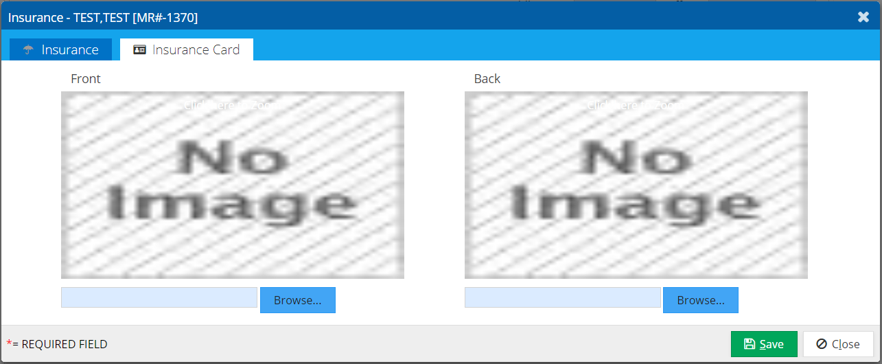 5. Click on Save button to upload the copy of the Front and Back page of the insurance card, respectively. Once saved, it will be visible in the Image Area of the Insurance Card window.