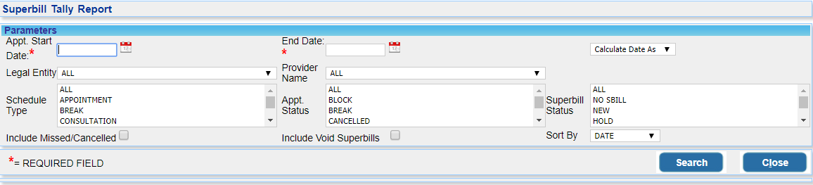 B2 report is used to reconcile appointments with manually entered charges and to review if the appointments for the selected date period have been billed. The report will indicate an X if no superbill and New or Hold if a superbill has been created and left in an unbilled status.
