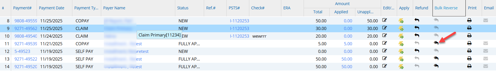 For bulk reversal, go to Payments from the main menu and choose Enter/Edit Payments.