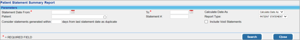 | Patient | Provide patient name to search for statements to a specific patient |