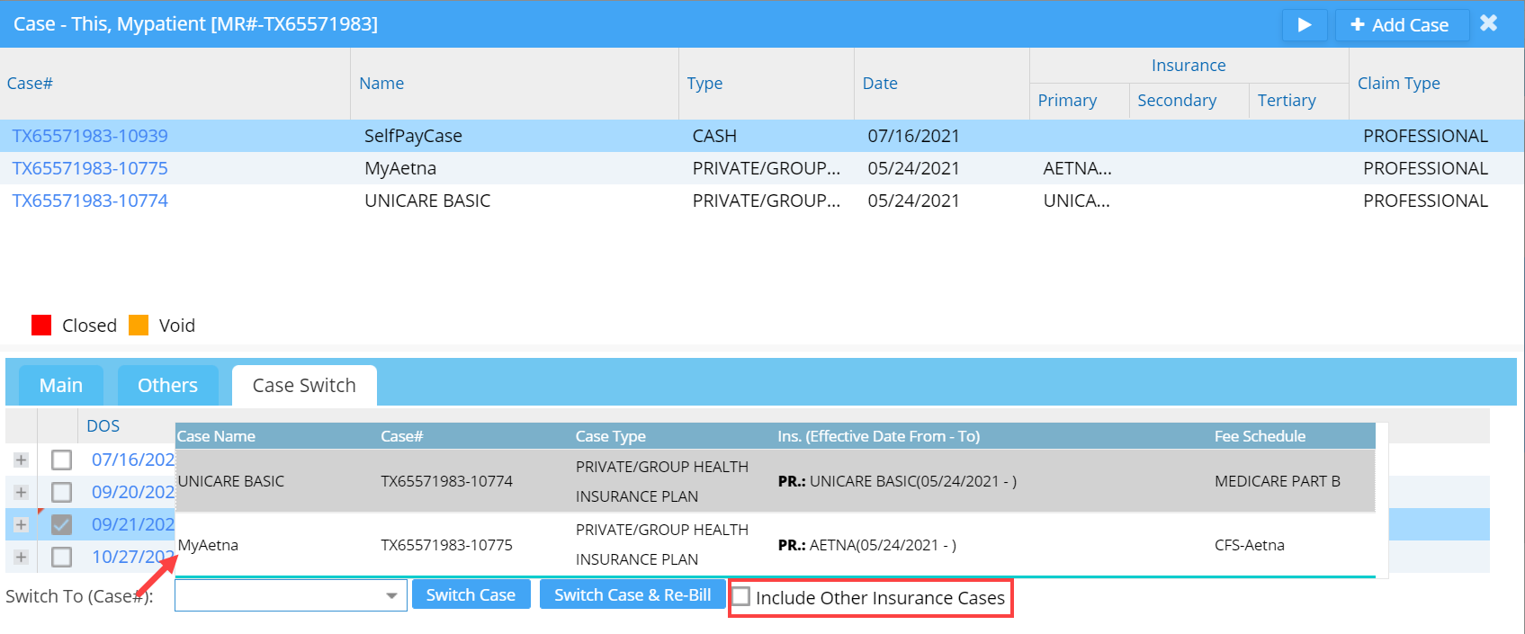 7. Once the required DOSs are selected, click on the Switch To drop-down. The drop-down would list all possible cases for switching along with Case Type, Fee Schedule, Primary, Secondary, Tertiary insurance names and effective dates, Case Number, and Case Name. Check the box Include Other Insurance Cases (highlighted in Image 5) to include cases with a different primary insurance.