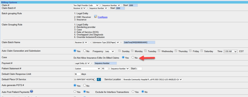 The Billing Options page under Advanced Setup has an entry, Do Not Allow Insurance Edits on Billed Claims. User input in this field will determine whether insurance in a case can be updated after claim generation. Selecting Yes would mean that patient insurance in the case cannot be updated after claims have been sent to the insurance. Conversely, the No option would allow users to edit insurances on the case, even after claim generation in the case.