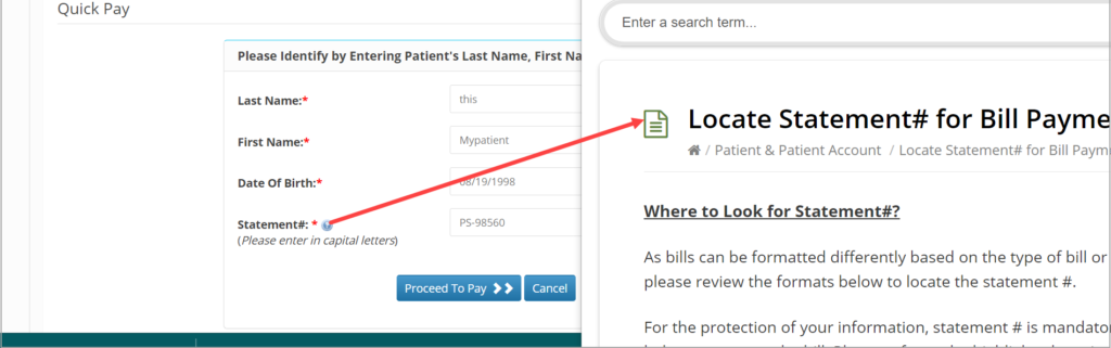 • Statement #: To help patients locate the statement # on the bill, a help icon is provided next to the statement #. On clicking the icon, patients are directed to the partner academy page to view the article with screenshots that explain where they can find the statement #.