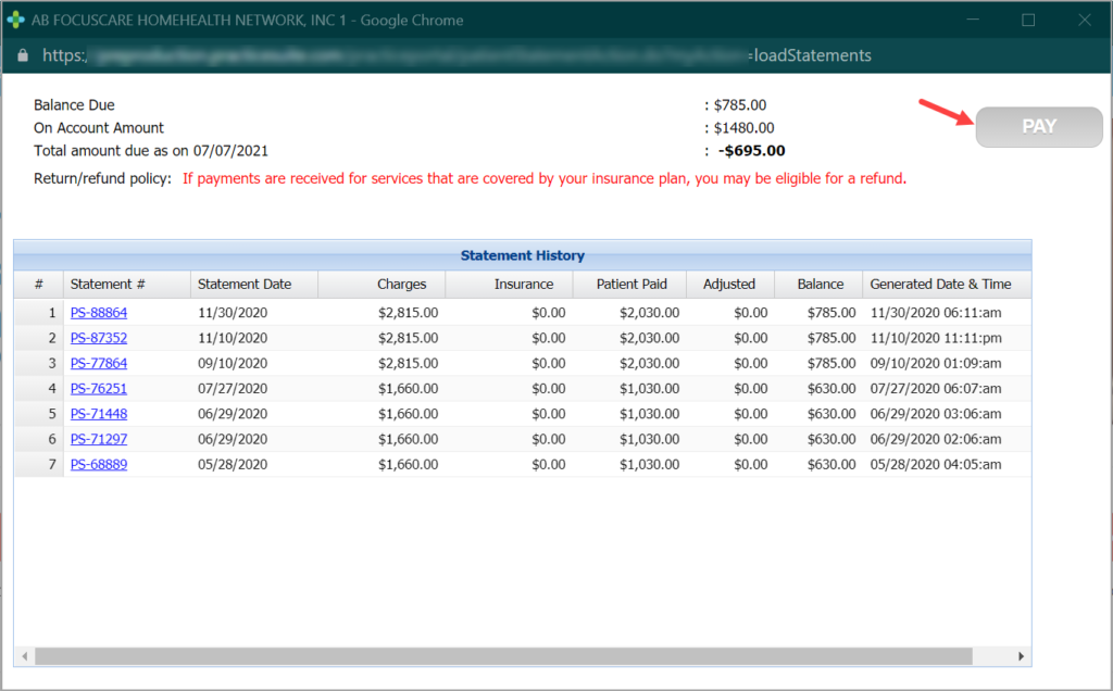2. This will bring up all the patient statements generated for that patient along with the outstanding due amount & a Pay button.