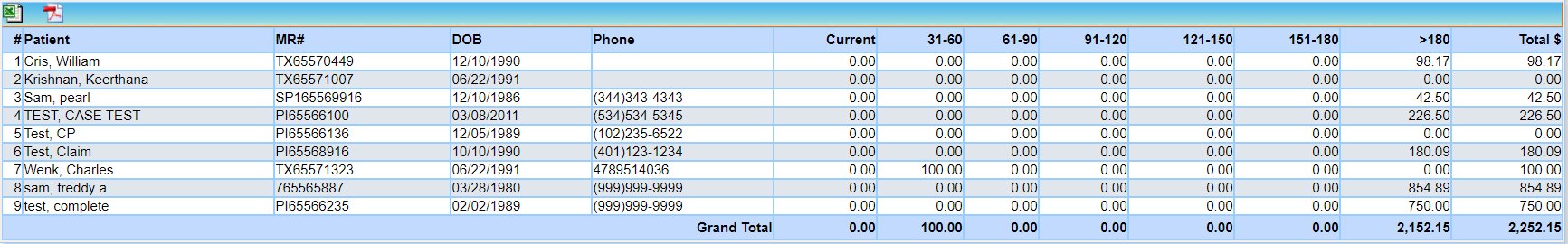 Like D4. Summary – Insurance Balance and Aging by Patient, this report also captures the patient-wise A/R (for both insurance and patient) with aging buckets.