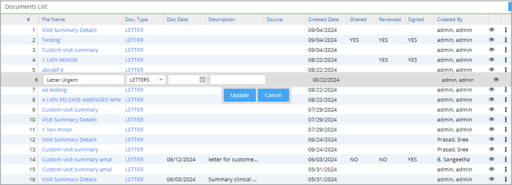 icon seen on the far right of the document listing in Image 3. In the document view page, users can sign documents electronically, share them with patients, and mark them as review completed.