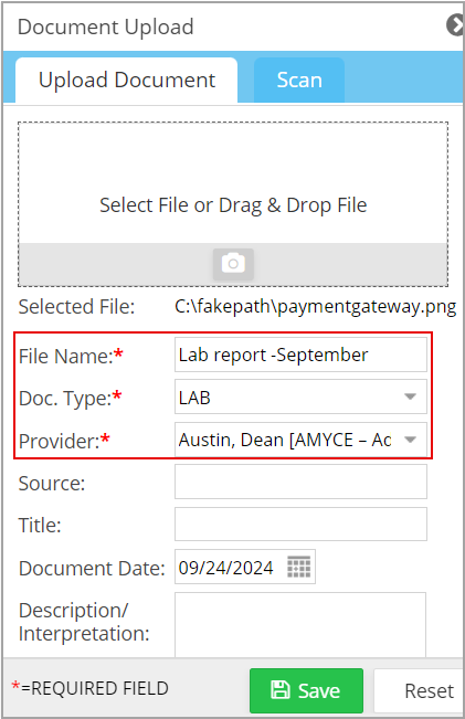 Once the file is uploaded, fill out the mandatory fields such as File Name, Document Type, and Provider before saving it (see Image 9).