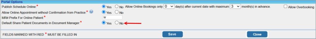 The Share with Patient checkbox lets users mark documents that can be shared with their patients. If the majority of the documents are to be shared with the patient, it can be defaulted to Yes from the portal options page so that users do not have to check the box every time a document is to be shared.