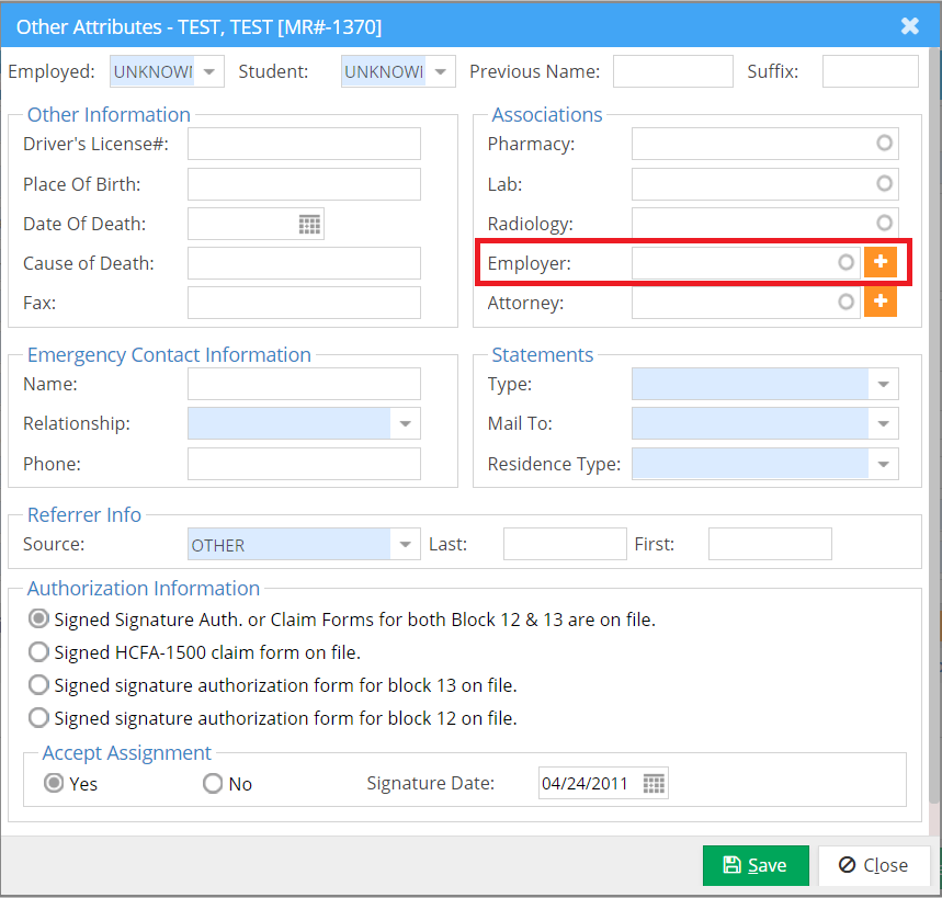 9. Click Save in the Other Attributes page (Image 2) to save the employer for the patient.