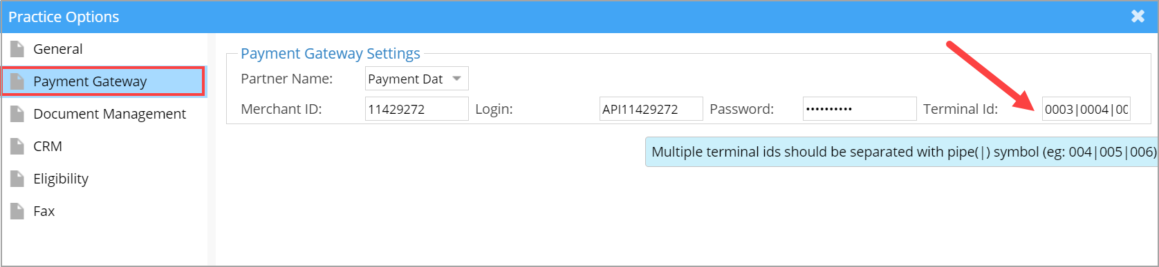 Multiple terminal IDs set up for each practice can be done through the ‘Payment Gateway‘ tab in Set Practice Options screen; see Image 1.