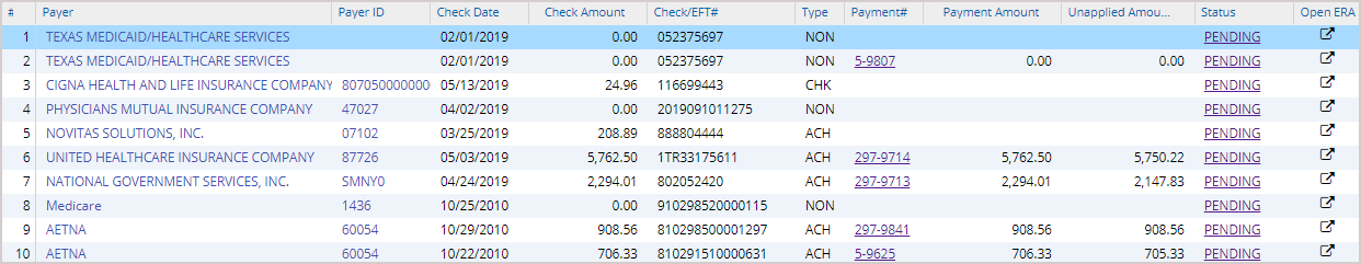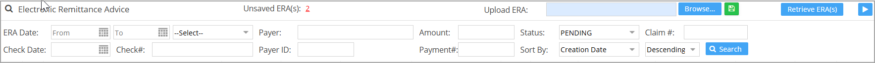 To view and process the ERAs in the system, select Payments from the main menu, and then click on ERA Posting. The ERA Listing page opens up, where all ERAs received are listed with the most recent on top. Provide appropriate search parameters to filter the ERAs. ERA Date, payer, status, payment #, and check # are some of the search fields.