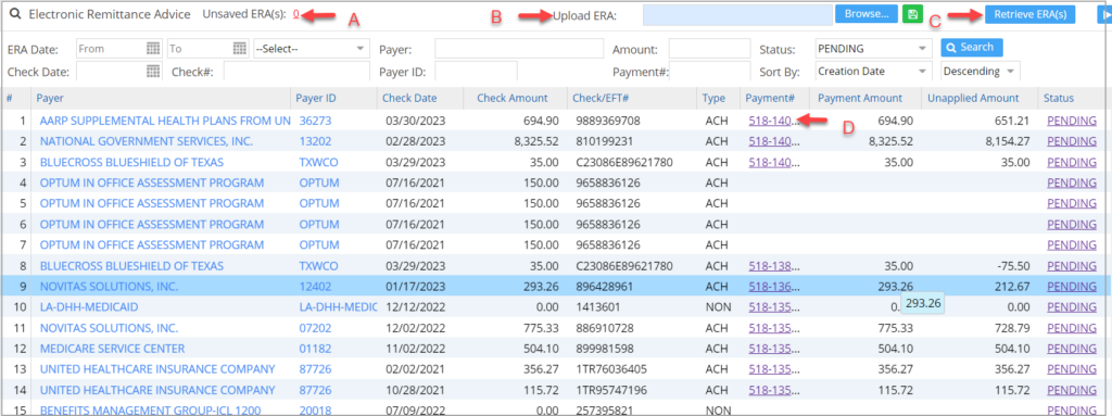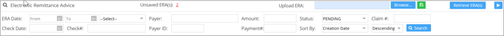 A. Erroneous ERAs due to syntax or semantic errors in the 835 file structure would show up in the Unsaved ERA(s) (labeled A in Image A). Clicking on the unsaved count hyperlink will open the file information in a pop-up window.