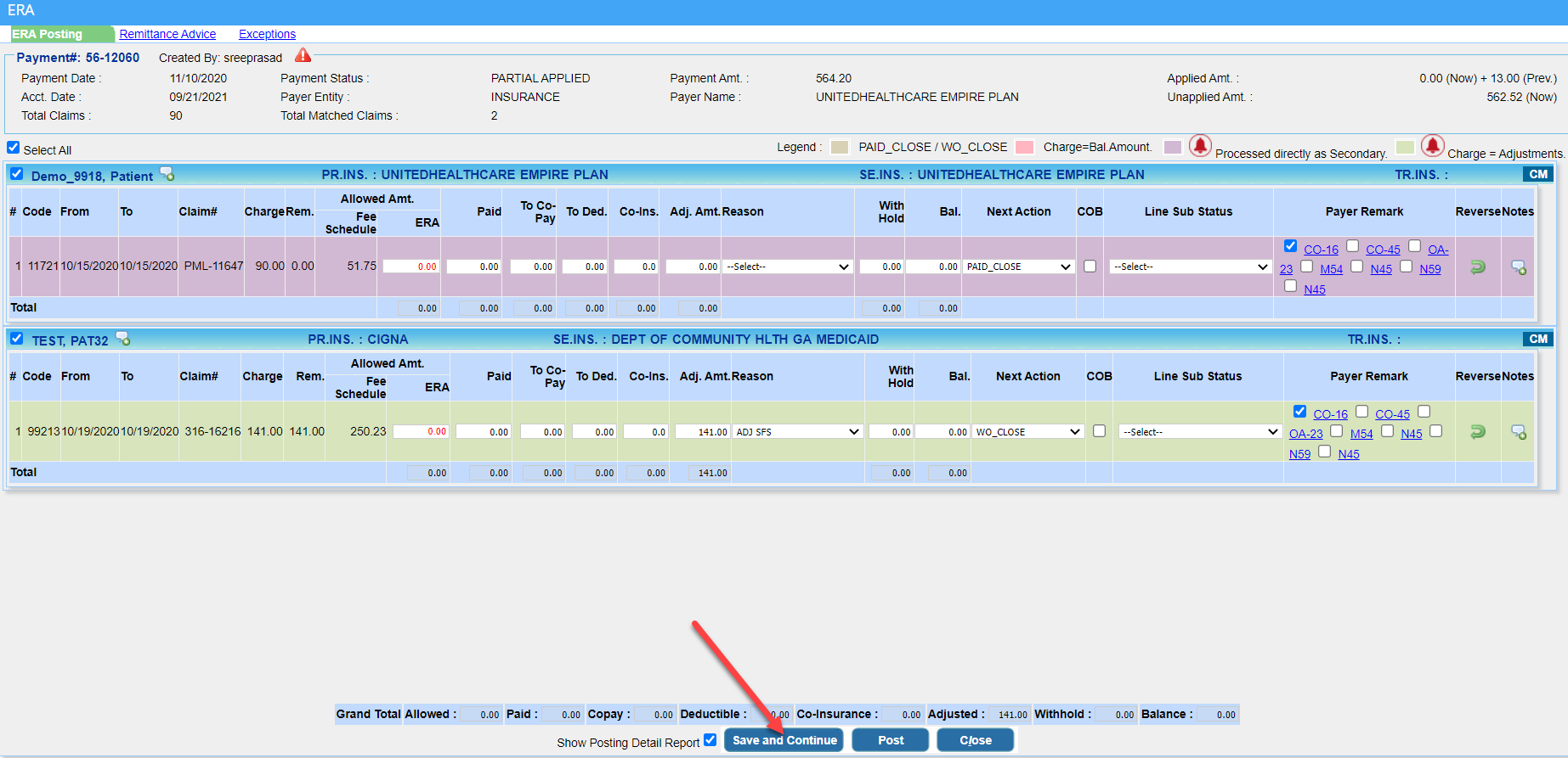4b. Another method by which users can conveniently post large ERAs in parts is by using the new “Save and Continue” option (highlighted in Image 6b) added to the ERA Posting screen. Users can click on this option to leave the ERA partially posted and return later to complete the posting from where they left off. Users can continue posting the remaining payments without having to exit the ERA posting screen.