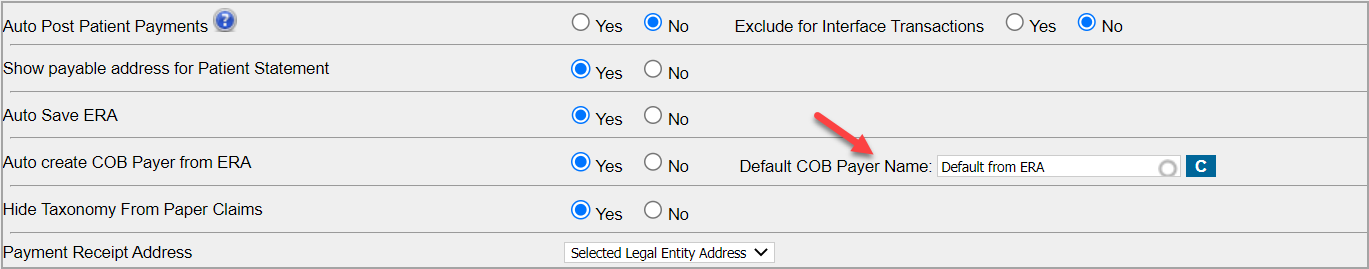 For the above automation to occur, in the Billing Options set up page, ‘Auto create COB payer From ERA’ option should be set to YES. The adjacent field named Default COB Payer Name will have the pre-set value “Default from ERA”. Practices can change this to any payer of their choice.