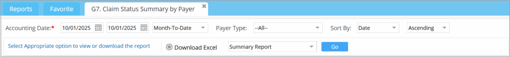 Since the G7 Report can span several months/years, the report output is exported to an Excel file and cannot be generated on screen. The Excel has three sheets: Claim status, Denials, and Rejects
