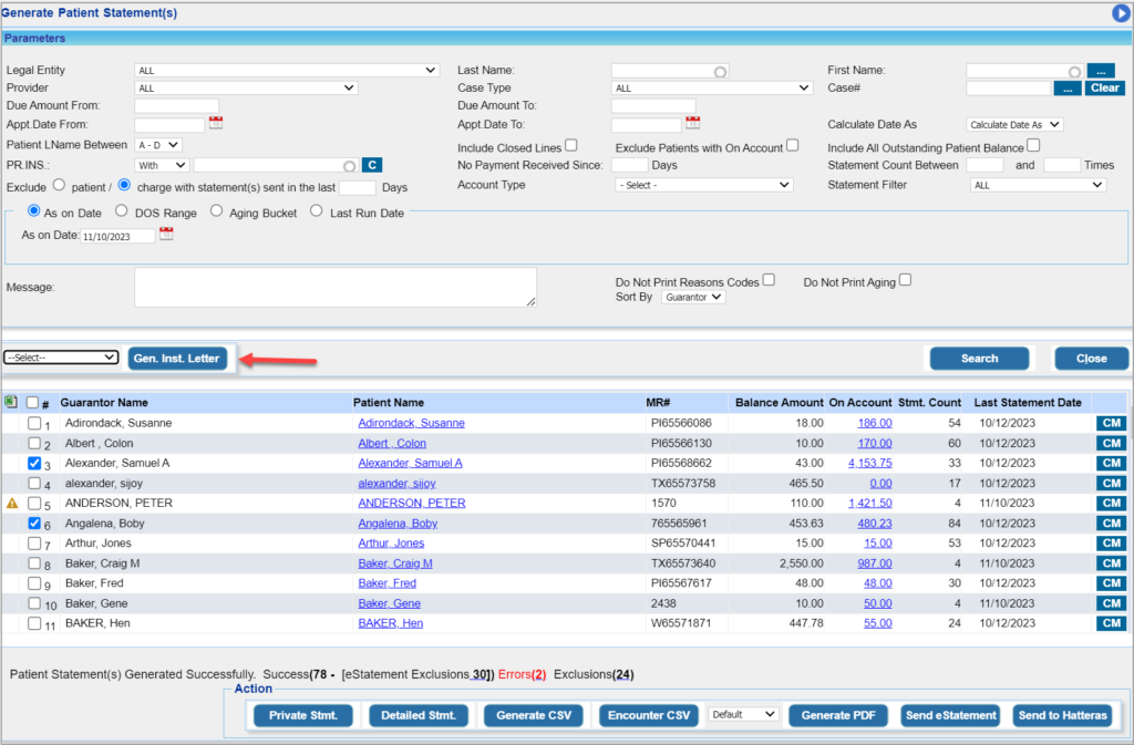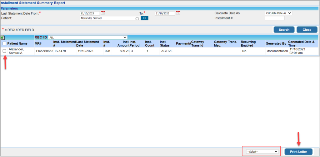 2. Select the installment statements by entering required parameters like Patient Name, Last Statement Date Range, Installment#, etc.