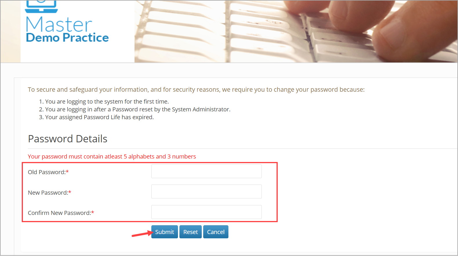 5. You will be directed to the page where you can change your password. Provide your current password in the Old password field and your new password in the New Password and Confirm New Password fields. Note that the password must contain 5 alphabets and 3 numbers. Click on Submit.