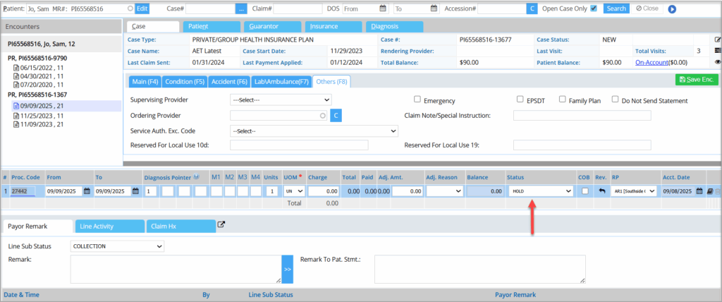 On the encounter line, select the Status as HOLD corresponding to the charge that needs to be put on hold and then click the Save button at the bottom.