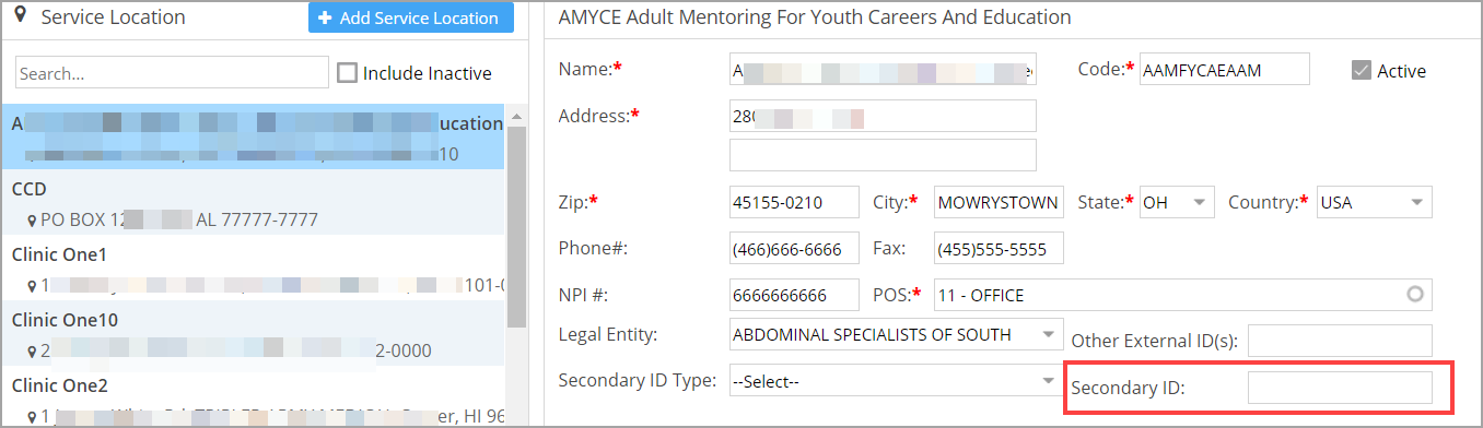 Populate CLIA In Claim using Service Location 1. Go to Service Location Set up page( Under Advanced Setup). 2. Set the “Secondary ID” field in the following format X4-<clianumber> eg. X4-1234567.