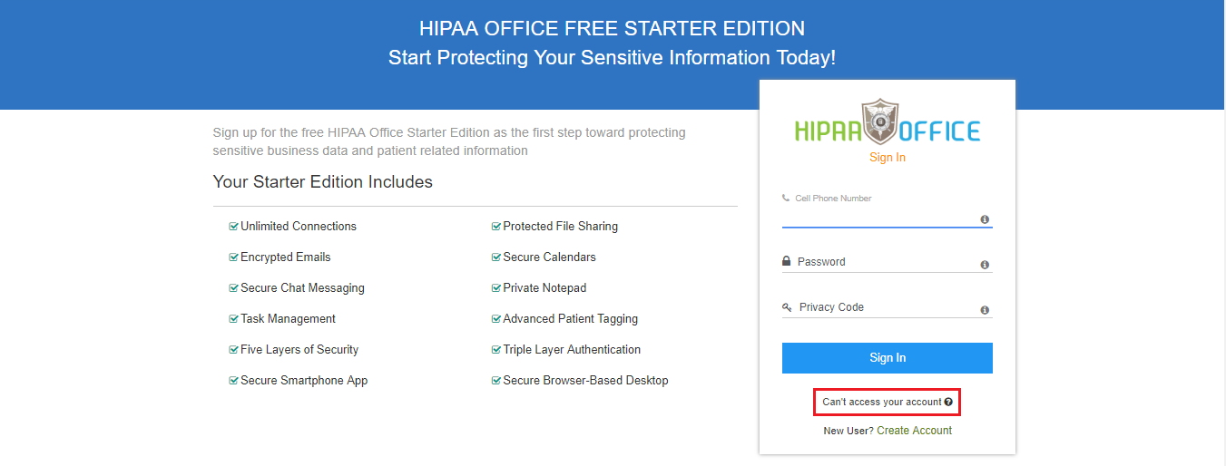 To reset the password for a HIPAA Office account, click on Can’t access your account? option from the Sign In page.
