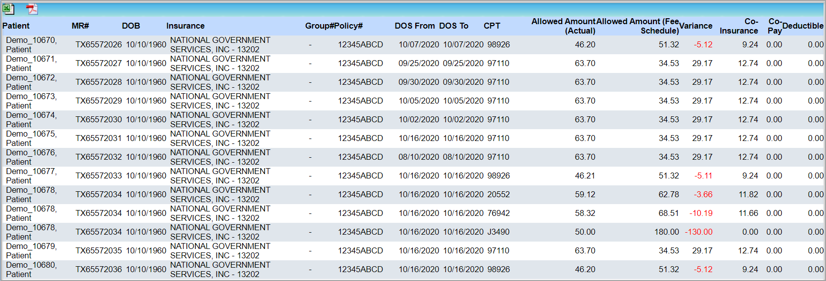An I16 report compares the actual posted with the fee schedule (based on the allowed) and reports the variance.