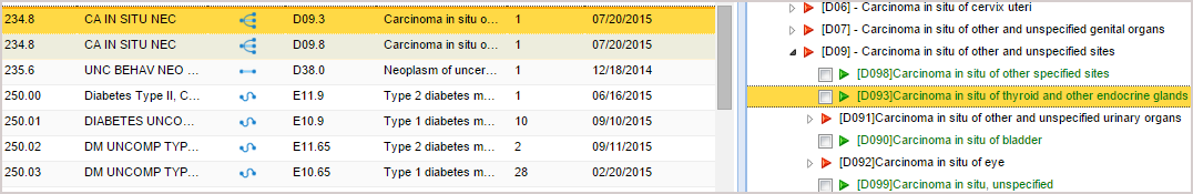 4. After a physician or coder enters a medical keyword or phrase in the search field, the relevant search results will be displayed below. Once an ICD-9 code is selected from the displayed results, the appropriate ICD-10 tabular will be automatically selected.