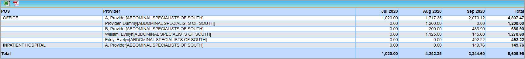 J19 report gives the month-wise charge totals by provider and place of service.