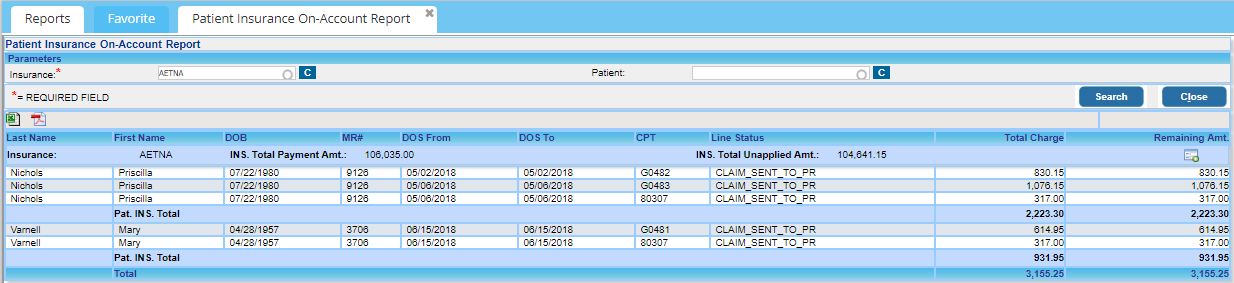 1. The top part of the report displays Total Amount Paid by the selected insurance and the total unapplied amount; the details of the payments made can be viewed by clicking the