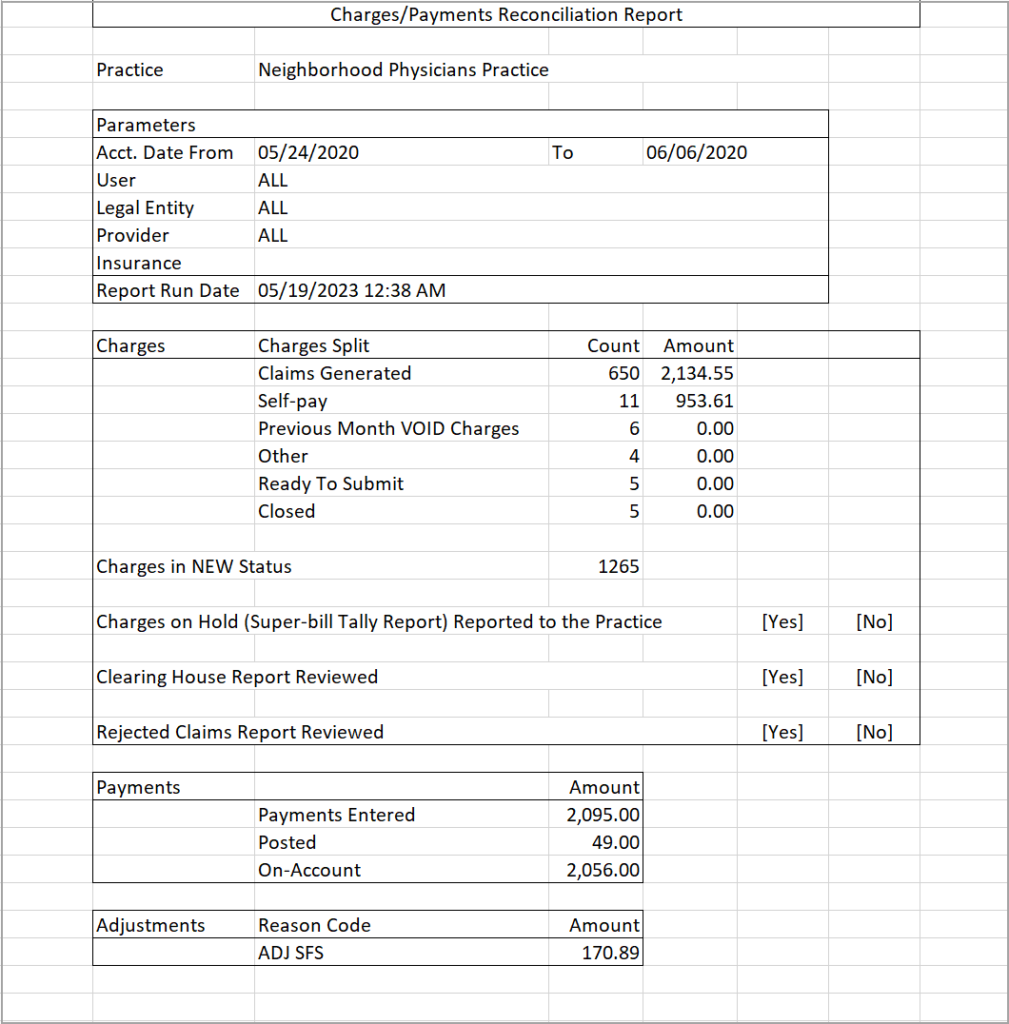 Sheet 6: Charges and Unposted Charges- Details of all charges posted in the date range. Any charges created but put to HOLD or NEW status will also be as shown here. Date of Accident (DOA) of the patient will also be displayed in this tab.