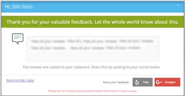 4. Upon completing the survey, an acknowledgment pop-up will be displayed to the patient to publish his/her review in Social Media (see Image 2).