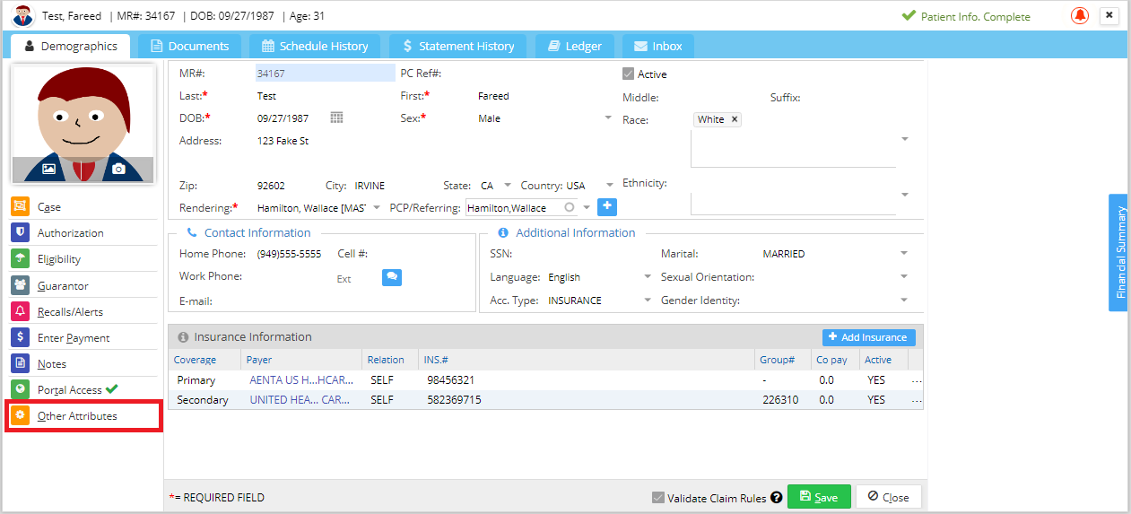 The Other Attributes page of the patient demographics contains miscellaneous information of a patient.