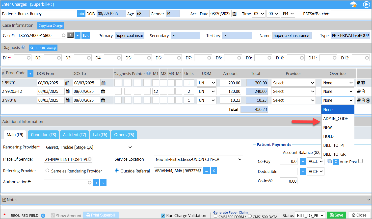 Insurance claims can be overridden to bill individual lines to the patient or to write them off. The Override drop-down in each line in the charge entry screen is used for this purpose. By default, the Override value is set to None, indicating that no specific override has been applied to the line. As a result, the line inherits the same status as the overall encounter.
