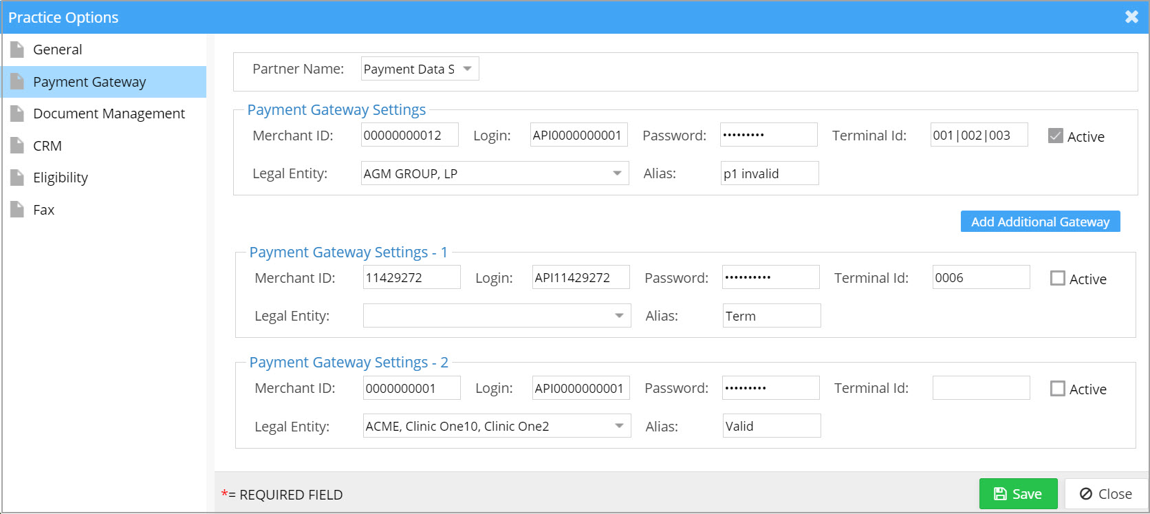 The Payment Gateway tab on the Practice Options page is used to configure the payment gateway for a specific practice. This setup enables integration with third-party software for processing credit card transactions.