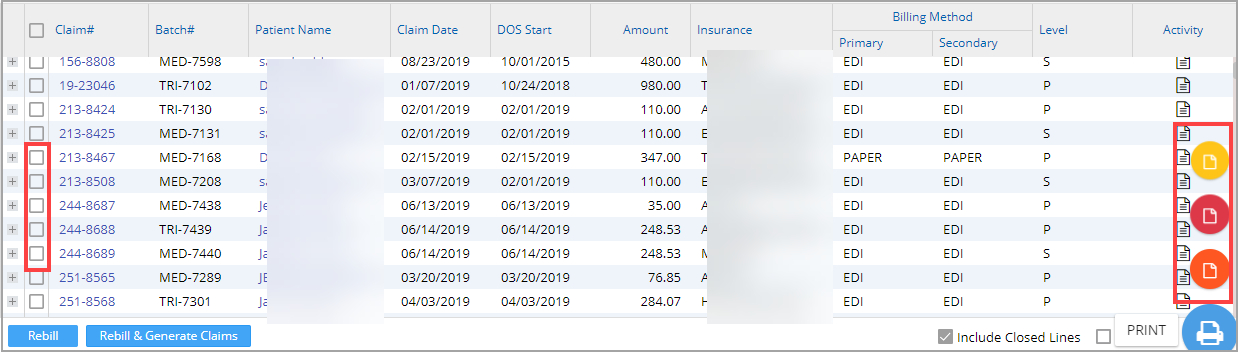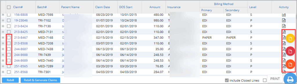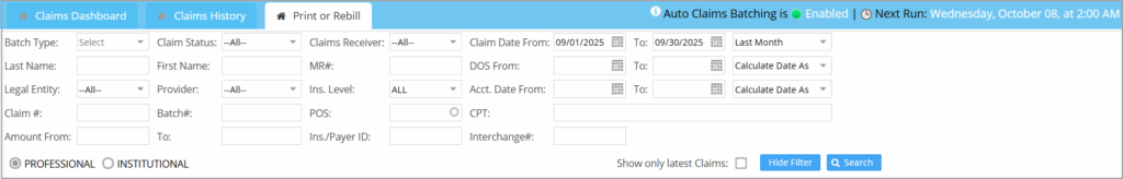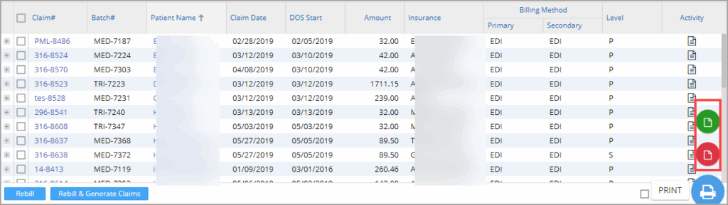 5. From the list, select the claim(s) that are to be printed by selecting the checkbox against the claims. If the claims selected are PROFESSIONAL, CMS 1500 print buttons (highlighted in Image 2) become available.