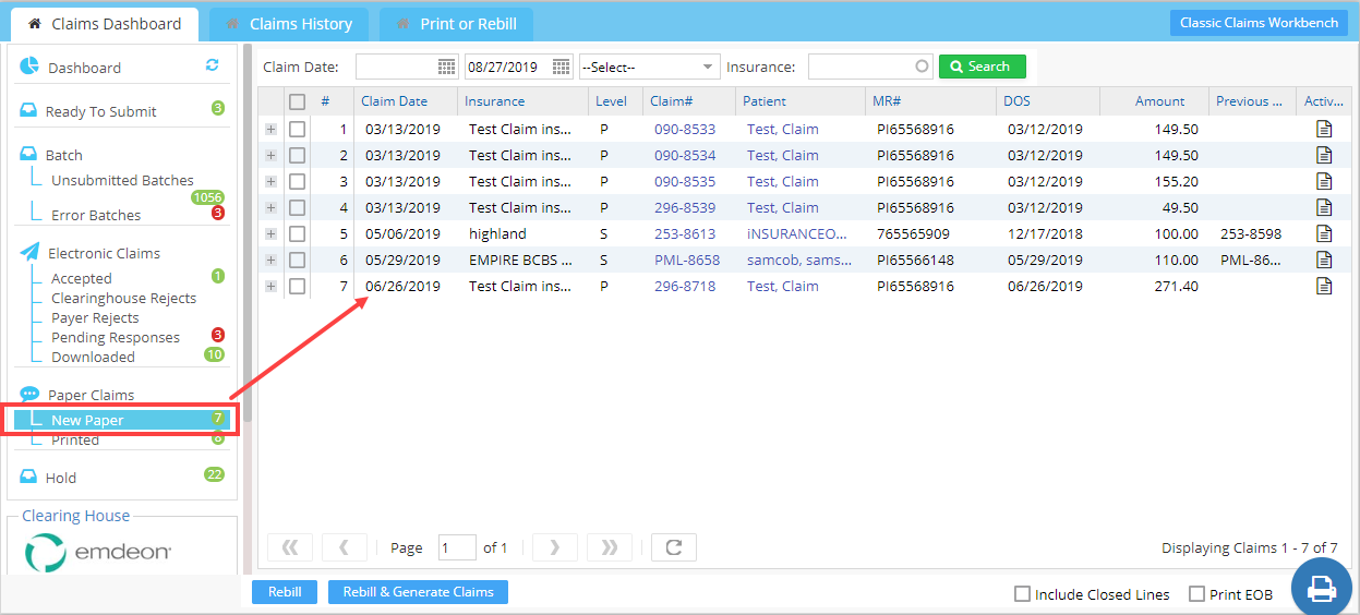 Regarding paper claims, the system maintains two statuses. They are New Paper and Printed. Paper claims for which claims have been generated and not yet submitted fall in the New paper bucket. When printed, they fall in the Printed bucket.