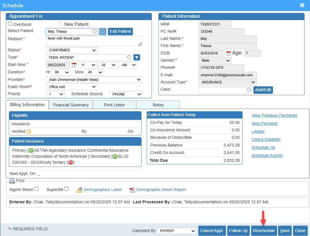 2. Only those appointments whose charges are in NEW and HOLD charges can be rescheduled. if the charge is in BILL_To_PT or BILL_To_PR status, the appointment cannot be rescheduled.