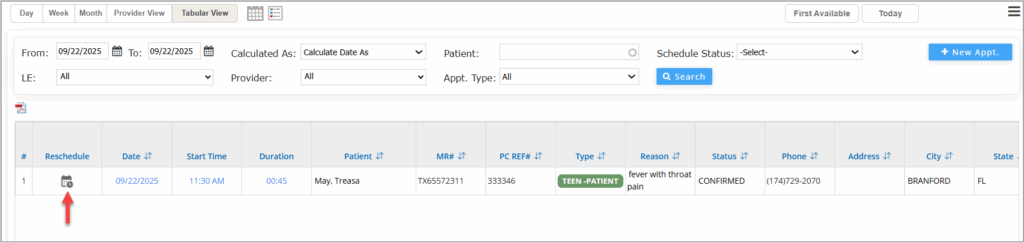 Option 1: Navigate to Scheduler → Tabular View, then click the Reschedule