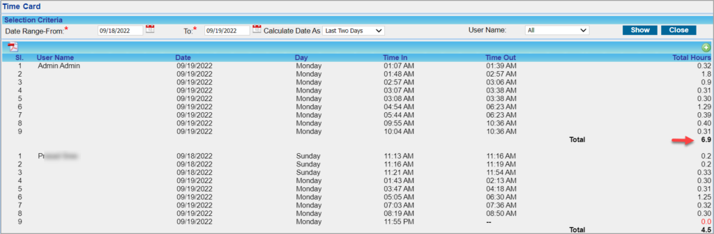Time Card Report lists the users who accessed the system in the specified date range. It provides info on the check-in and check-out timings of the user in each day and the total hours spent.