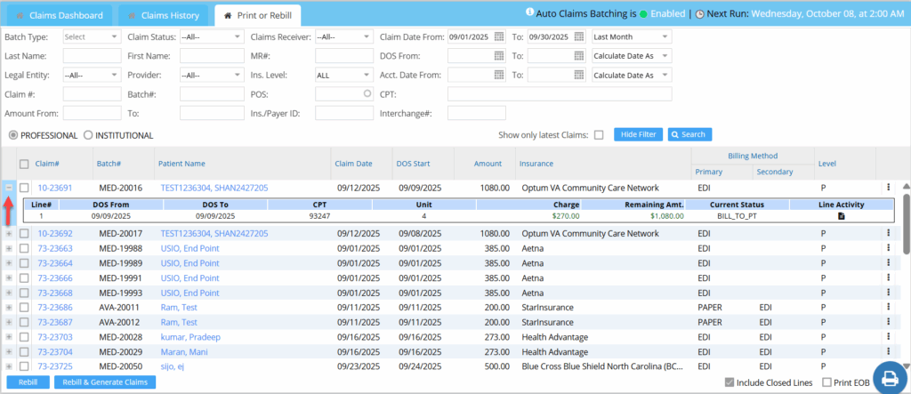 The Print/Rebill screen can be used to view the current line status of a claim and any previous claim or line activity. To view the claim details, follow the steps below.