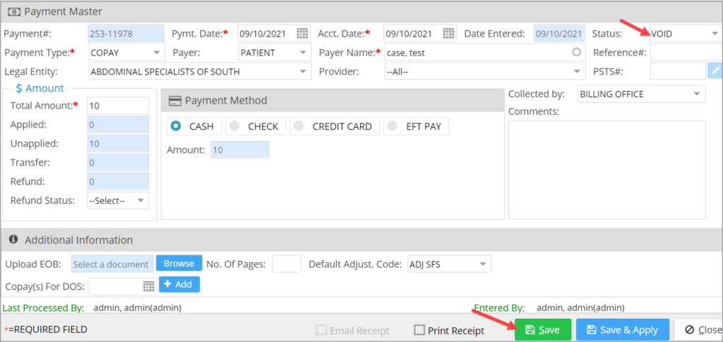 2. Click on the payment to be deleted. This takes us to the Payment Entry/Edit screen. From the status drop-down, select VOID and then save the payment; the payment will be logically deleted from the system.