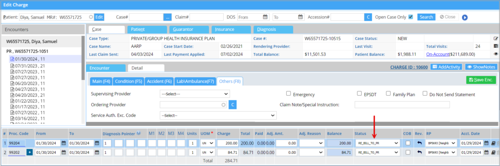 5. Identify the line to be voided and change the line status to REBILL. (Note: No other change is to be made to the information in the encounter line.)