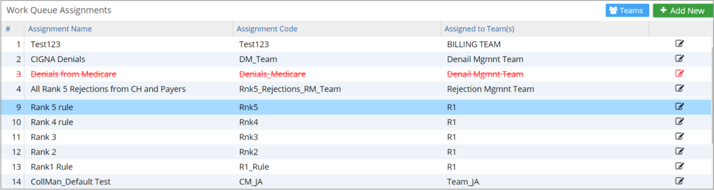 Clicking the “Configure” option on the Billing Options page brings up the Work Queue Assignments screen where all the existing assignments are listed (as shown in Image 2). These can be modified from here by clicking on the icon