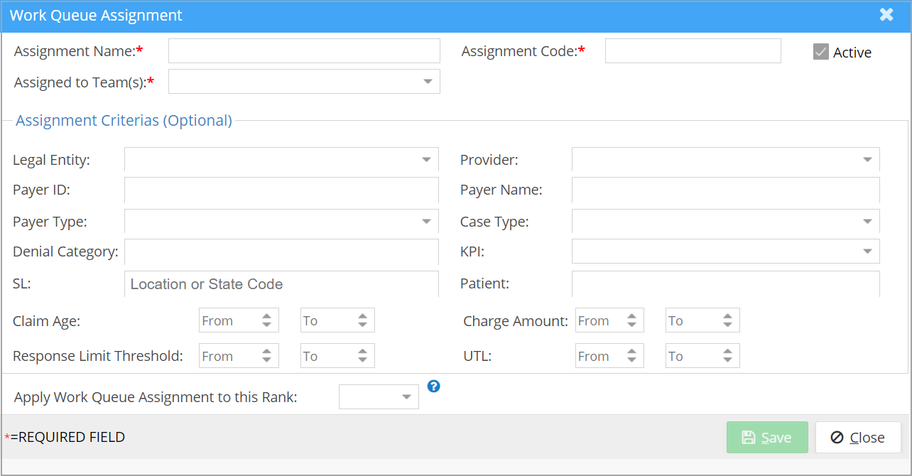 | Payer Type | If the Assignment is to be based on payer types, select them. Multi-select drop-down |
