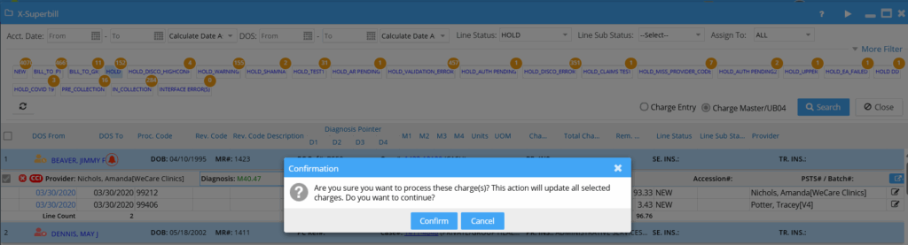 Users can rebill multiple charges in HOLD status directly from the XSuperbill screen, streamlining workflow by eliminating the need to revert statuses manually. The system intelligently assigns the correct next status based on the prior state. Charges in a HOLD_ sub-status can also be rebilled without having to revert to their previous status, thereby simplifying the workflow.